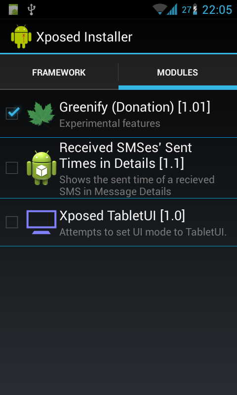 - Abrir Xposed Installer, recoger greenify dentro módulos pestaña, pestaña estructura abierta a continuación, pulse instalar / actualizar y reiniciar el sistema.